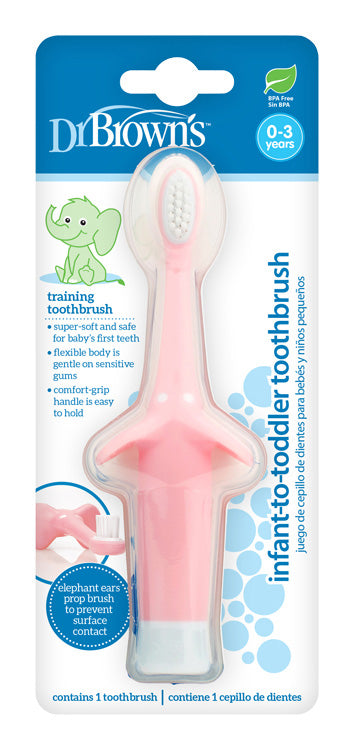 Výučbová zubná kefka pre batoľatá a deti 0-3 roky Veľmi jemná a bezpečná kefka pre prvé zúbky. Pružné telo je jemné na citlivé ďasná. Komfortná rúčka vhodná pre detský úchyt. Uši sloníka zabraňujú kontaktu kefky s povrchom pri položení. Dr.Brown´s zubná kefka pre batoľatá a deti pomáha zaviesť správne návyky pri ústnej hygiene. Použitie Zubní lekári odporúčajú vymieňať zubnú kefku každé 3 mesiace.